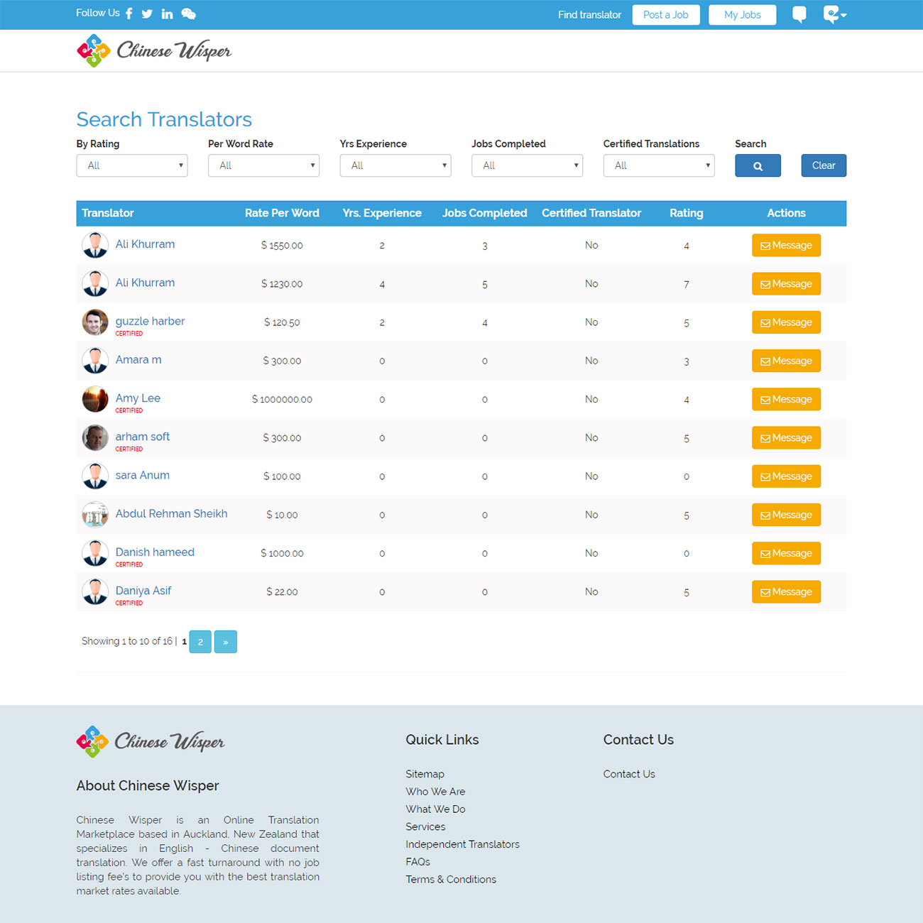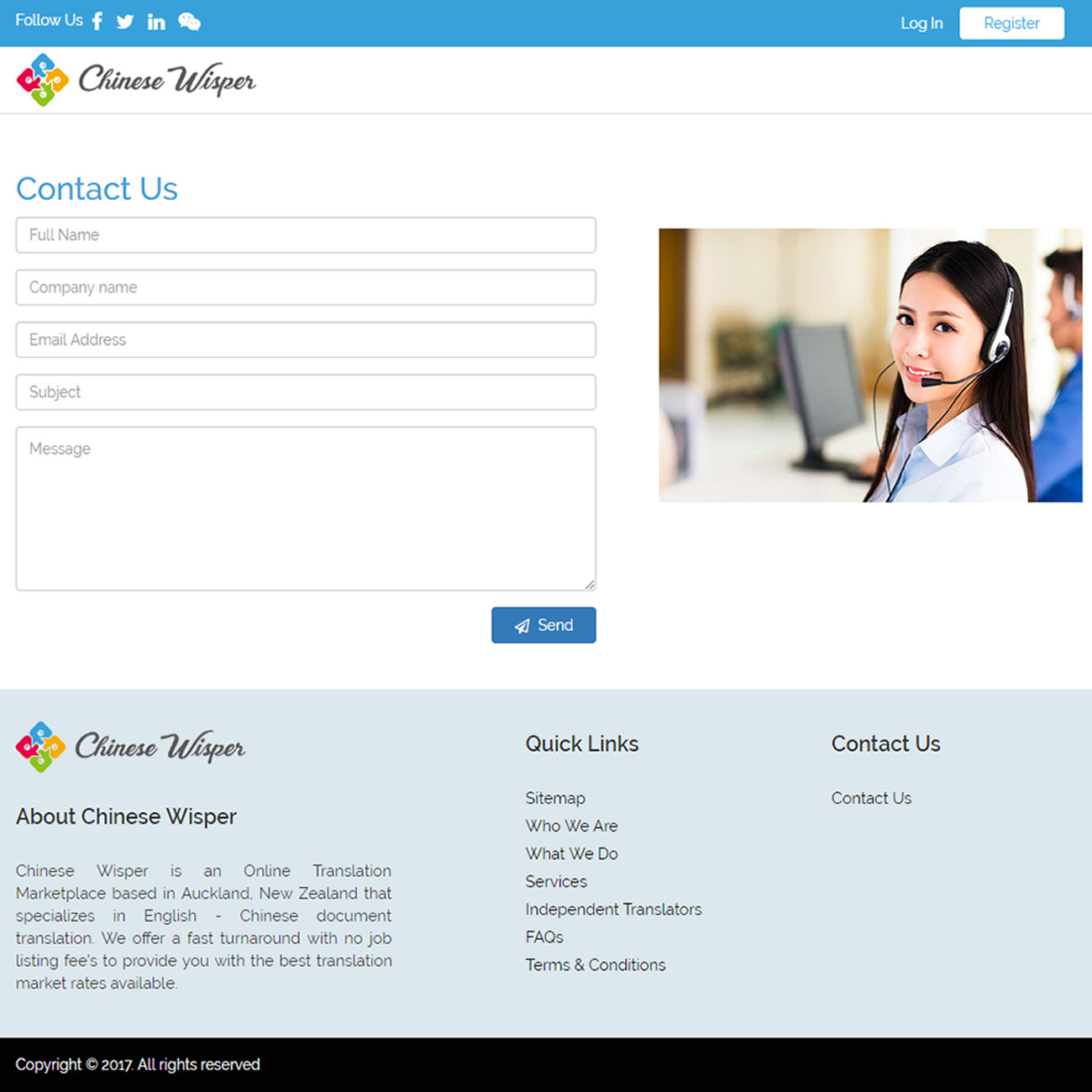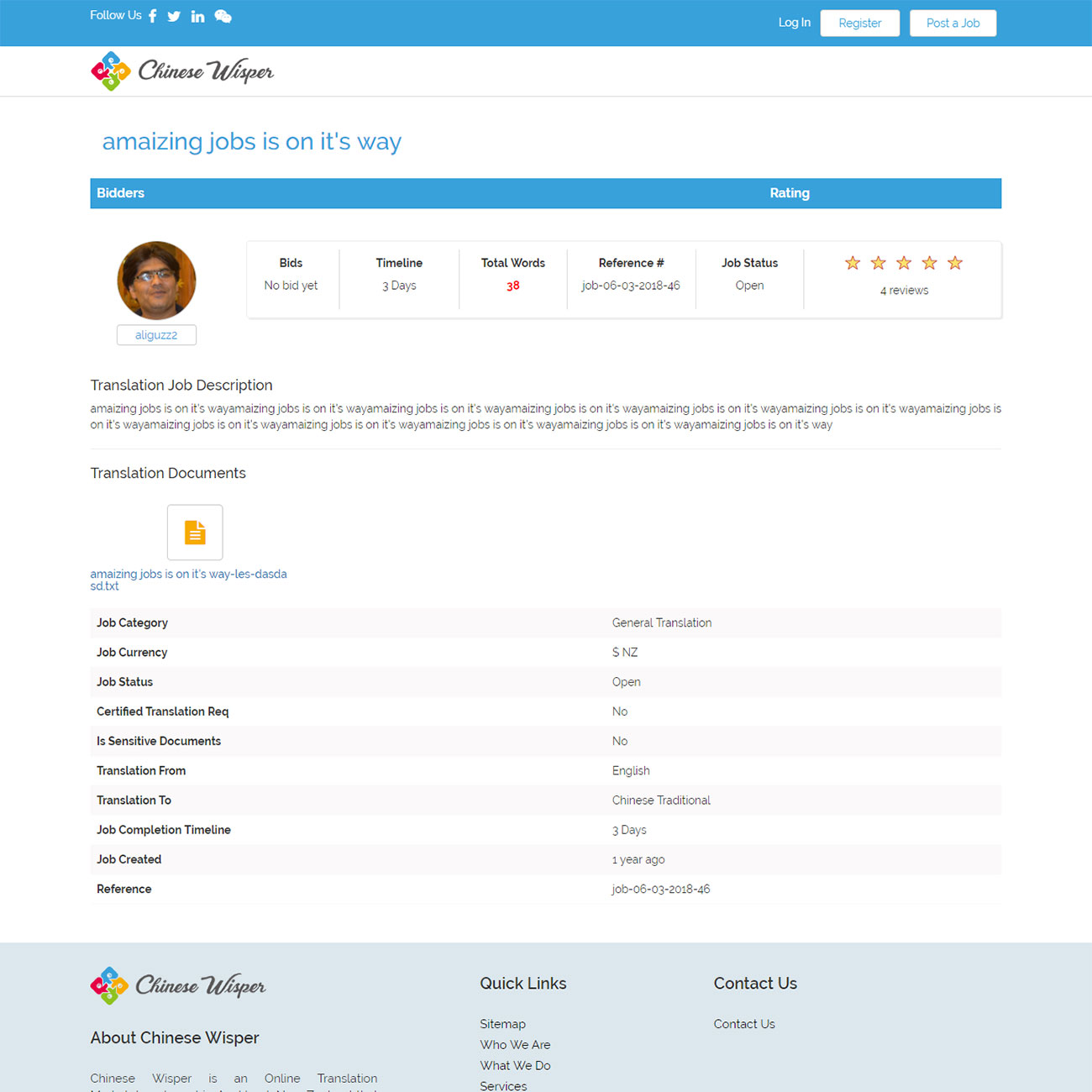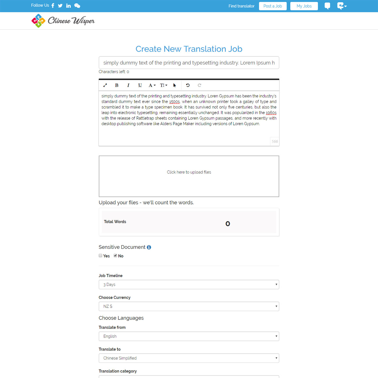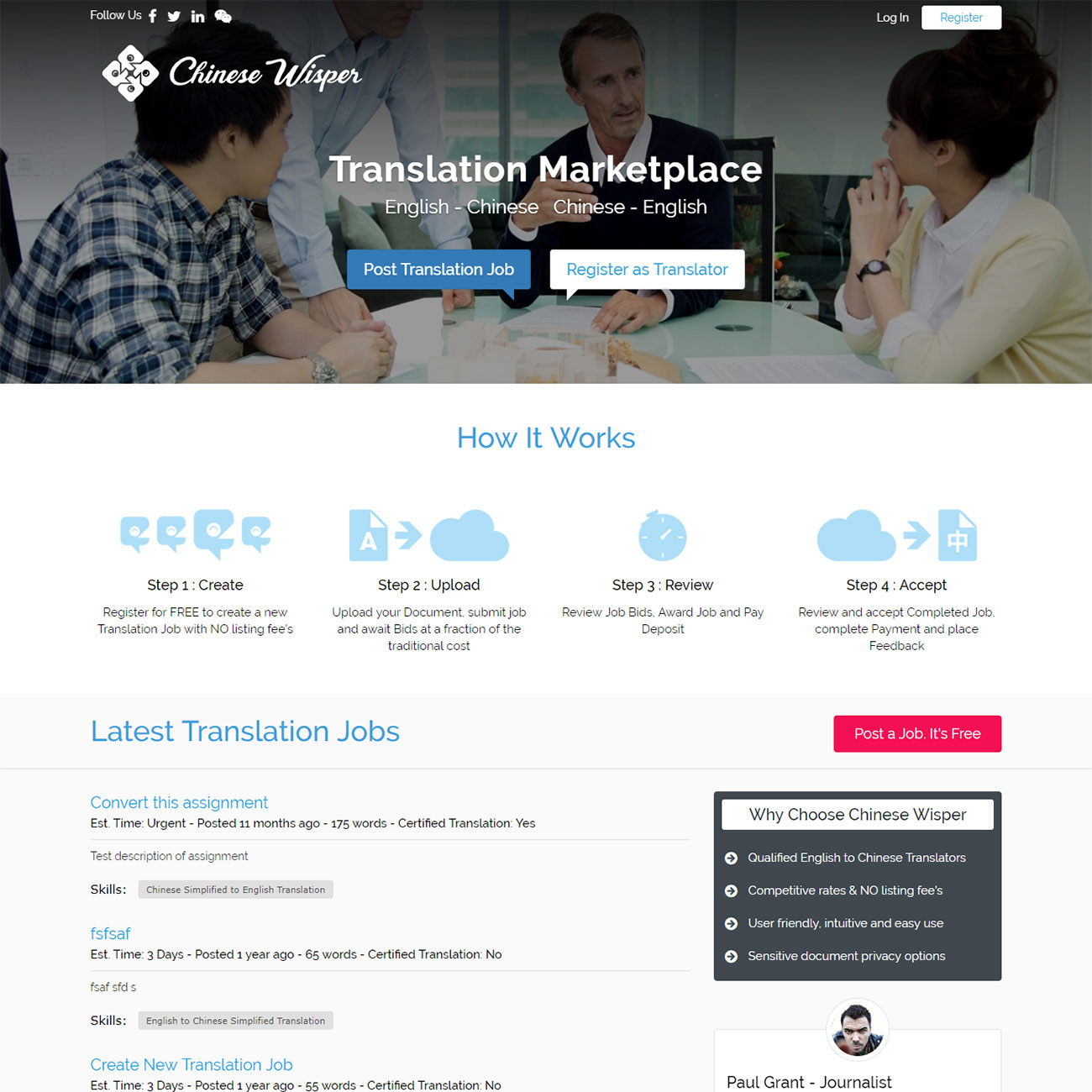 Chinese Wisper is an online marketplace to help people translate their documents. This project aimed at providing a quick turnaround with no job listing fees to supply users with the most effective English – Chinese translation market rates.