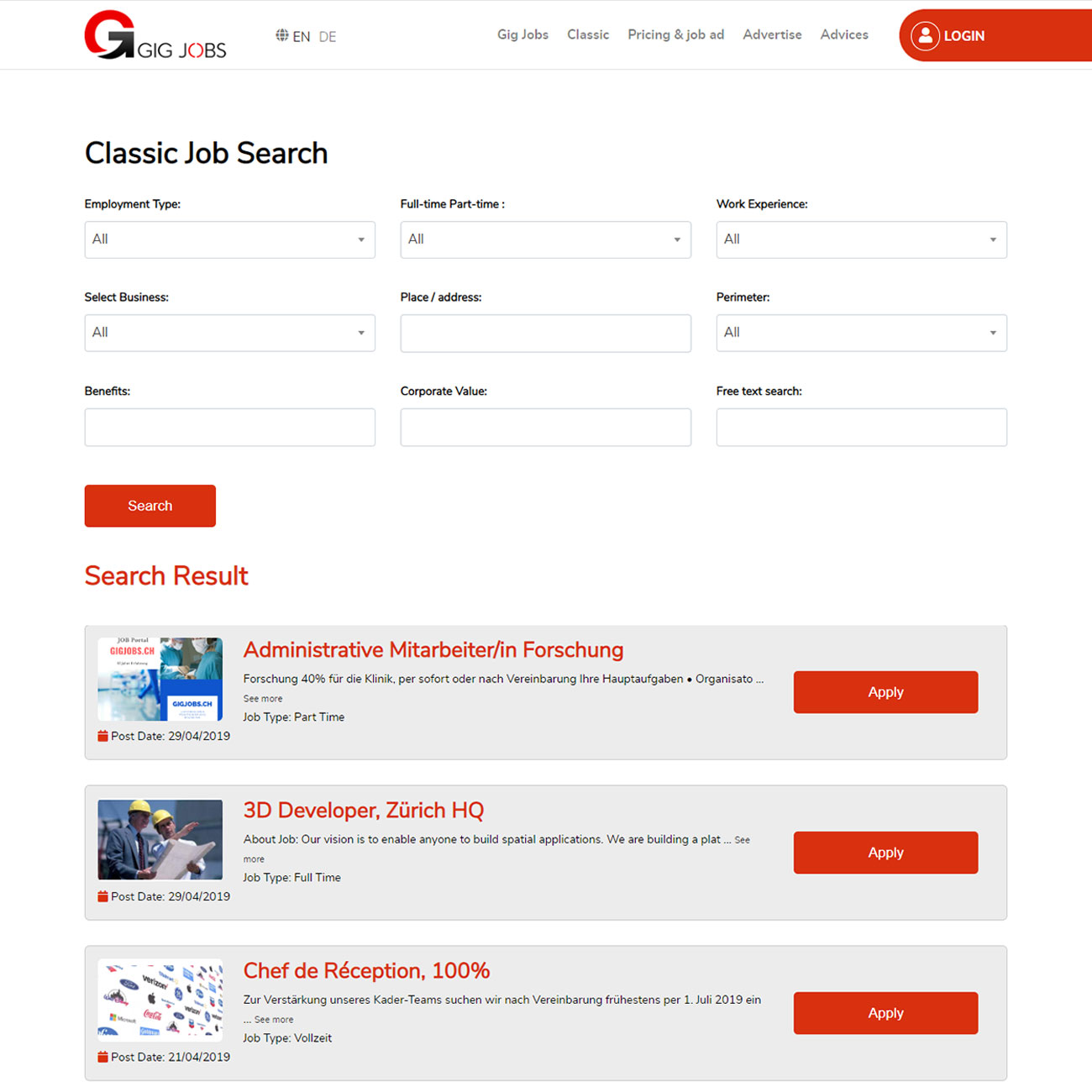 Client’s original concept was to build a job posting and employment platform for Swiss nurses’ employment agencies and from where people can find the right specialist personnel more reliably. Later on, he asked to cover other industries like hotels and event management companies with skilled working staff.