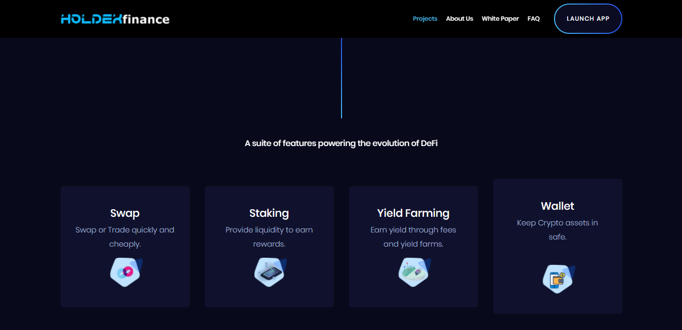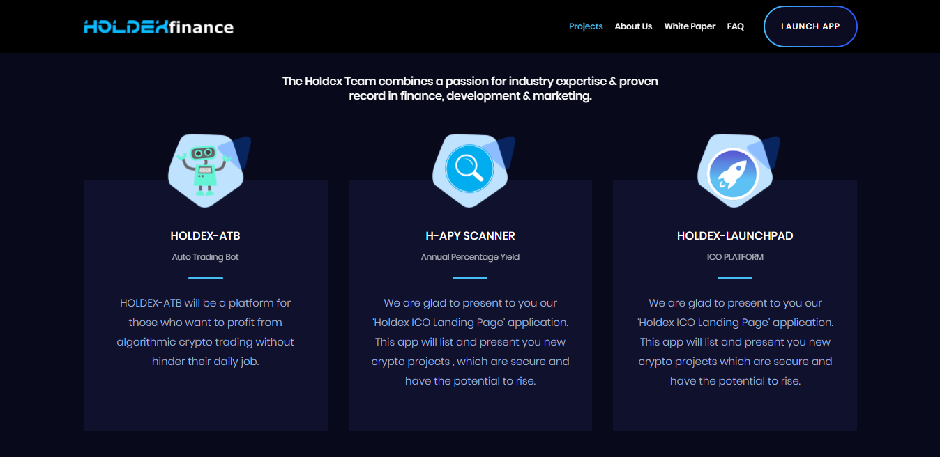 Holdex finance is one of the most powerful decentralized platforms for finance management. This DeFi solution features an automated market maker, annual percentage yield scanner, auto trading bot, and H-staking for easiest staking and crypto trading.